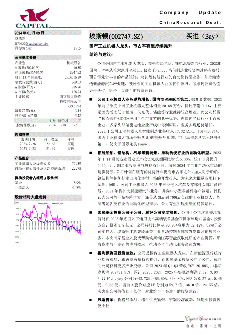 C o m p a n y U p d a t e C h i n a R e s e a r c h D e p t . 阿2024年01月09日赵旭东方针价(元) 19.5 公司根基资讯财产别机械设备A股价(2024/1/8) 16.30 深证成指(2024/1/8) 8947.72 股价12个月高/低29.38/16.29 总刊行股数(百万) 869.53 A股数(百万) 786.76 A市值(亿元) 128.24 次要股东南京派雷斯特科技无限公司(29.31%) 每股净值(元) 3.15 股价/账面净值5.18 一个月三个月一年股价涨跌(%) -10.6 -18.3 -28.1 近期评等出刊日期2023-7-28 2023-9-22 前日收盘22.68 21.49 评等买进买进产物组合工业机械人及成套设备77.3% 从动化焦点部件及活动节制系统22.7% 机构投资者占畅通A股比例基金8.9% 一般法人47.8% 股价相对大盘走势埃斯顿(002747.SZ)买进(Buy) 国产工业机械人龙头,请遏制利用慧博投研资讯所供给的全数办事。并持续渗入新能源汽车财产链,投资方合计投资3.8亿元,公司持股比例从90.95%变动为52.12%,公司工业机械人2023年曾经进入汽车及零部件头部厂商产线年将扩大新能源汽车营业,2023H1国内市占率从第六跃升至第二,2023年前三季度中国工业机械人全体销量20.68万台,或代他人之户口买卖此份演讲内描述之证。